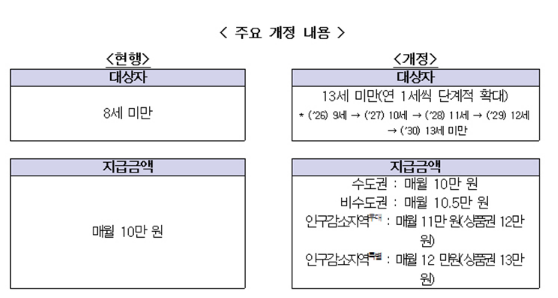 핵심 요약: 아동수당이 13세 미만까지 단계적으로 확대되며 비수도권 및 인구감소지역은