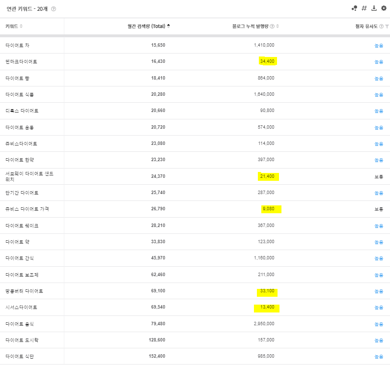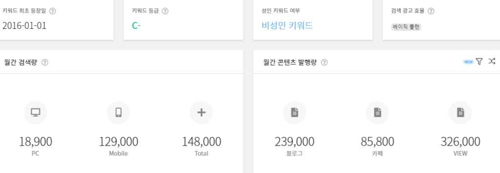 다이어트라는 키워드를 검색해보면 월간검색량이 148,000, 콘텐츠 발행량이 650,800건이네요. 여기서 검색량에 비해 발행량이 많은 것을 알수 있습니다.