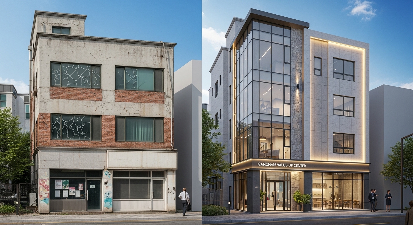 - **① 리모델링을 통한 '면적' 확보:** 낡은 계단실을 줄이거나, 엘리베이터를 외벽에 설치(증축)하는 등 임대 가능 면적(전용률)을 최대한 늘려야 합니다.